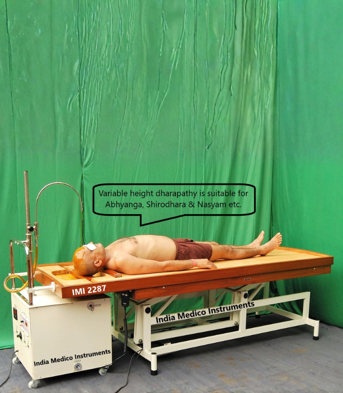 | Massage Table: | Variable height dharapathy is suitable for Abhyanga, Shirodhara & Nasyam etc. |