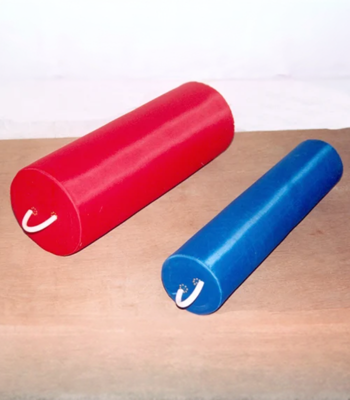 The foam padded bolster is covered with bright colour Nylon / Tetron cloth. It has a solid plasticcore & is suitable for Rolling / Rocking exercises.