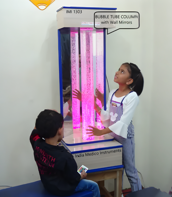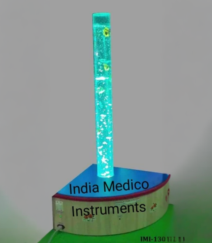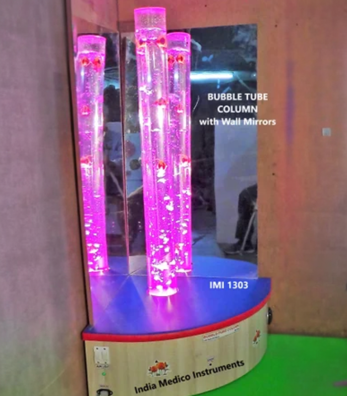 Bubble tube column is great for use in multi-sensory environments. The LED lighted column’s colour cycles through Four different shades to produce a calming, relaxing effect. This product can be used to calm dementia patients or for relaxation. * Bubble column is made of an acrylic tube of 10 cm diameter with 120 cm height and fitted on a heavy wooden base.* Mirrors: Bubble Column is fitted with Three acrylic mirrors (non-breakable) for multi-reflection of the tube.* LED Colour Source: Colours in bubble tube (Red / Green / Blue / Yellow) can be changed with remote in a sequence or in static mode.* LED Source: Light source is fitted inside the base for the safety of clients. * Air Bubbles: Air Bubbles rise slowly & continuously with changing colours & Air bubbles are controlled with Speed control switch,* Power: LED colour Source has a long-life span & has a very low power consumption. * Overall Size of The Unit: 44cm x 44cm x 124cm high.* Unit works on 220V AC/50Hz.