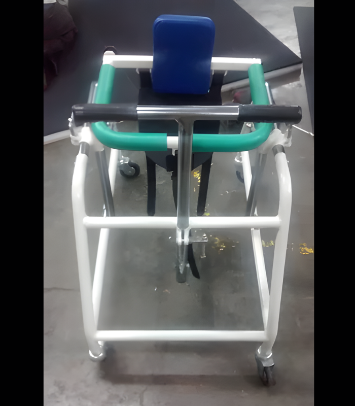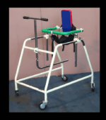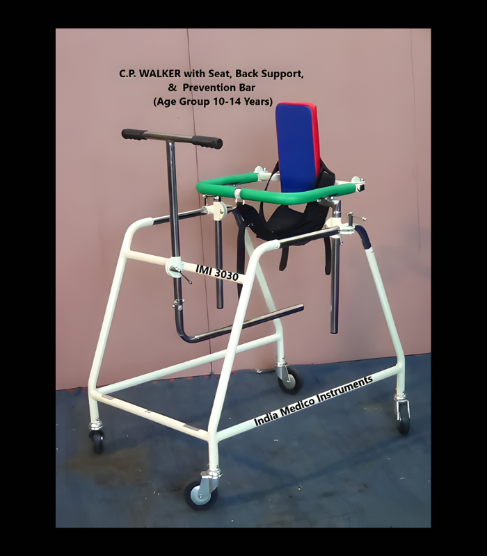 IMI 3030. C.P. Walker with Saddle Gear (Seat), Back-Support and Scissors Gait Prevention Bar, walker is suitable for children with in age group of 10 to 14 years. * Construction: Strong tubular steel frame of 25mm & 22mm dia tube.* Frame: Height of frame is 70cm. approx.* Support Ring with Seat & Back-Support: Rectangular shaped Ring with adjustable saddle gear & Back-Support hold the child in an upright position.* Size of Ring: Width Inside Ring is 35cm x 30cm deep.* Height of the Chrome-plated Ring is adjustable from 85cm to 110cm.* Entrance: Through Rear hinged bar of the Ring. * Handle: Chrome-plated Handle bar with scissors gait prevention bar is provided at the front for the patient to hold and is adjustable in height from 70cm to 110cm. * Scissors Gait Preventive Bar:  Provided with foam cover.  * Mounted on four 10cm size ball bearing rubber casters. * Finish: Powder coated finish with Chrome-plated working parts.