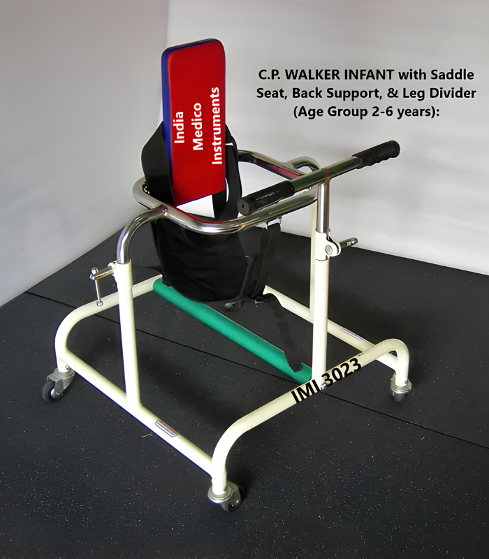 IMI 7461. Infant’s C.P. walker with Saddle Seat, Back Support & Scissors Gait Prevention Bar is suitable for children within the age group of 2 to 6 years. * Construction: Strong tubular steel frame of 25mm dia. tube. * Seat: Fitted with rectangular shaped Ring with adjustable saddle gear to hold the child in an upright position.* Back Support: Padded Back support with a Chest Belt is provided to support the Child. * Arm Support: Padded Arm Support.* Handle; Chrome-plated Handle is provided at the front for the patient to hold. * Handle Height; Adjustable from 56cm to 80cm,* Height of the Chrome-plated Ring is adjustable from 51cm to 74cm.* Ring’s Inside Measurement: Width 25cm x Depth 23cm.* Size: Overall width of the frame 50cm and length 53cm.* Scissors Gait Preventive Bar: Provided with a foam cover.  * Mounted on four 5cm size ball bearing rubber castors.* Finish: Powder coated finish with Chrome-plated working parts.