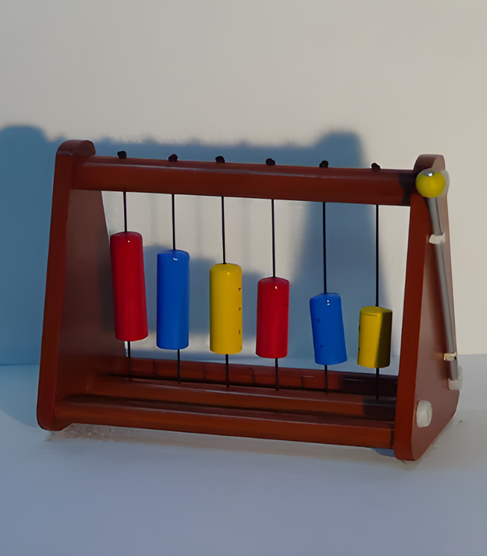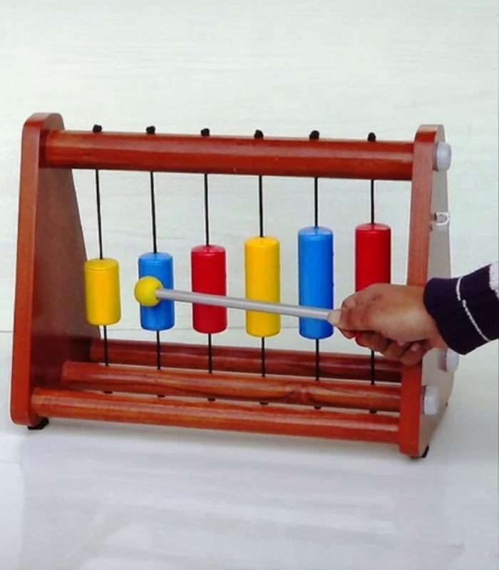 * Six colourful wooden chimes suspended within a strong frame.