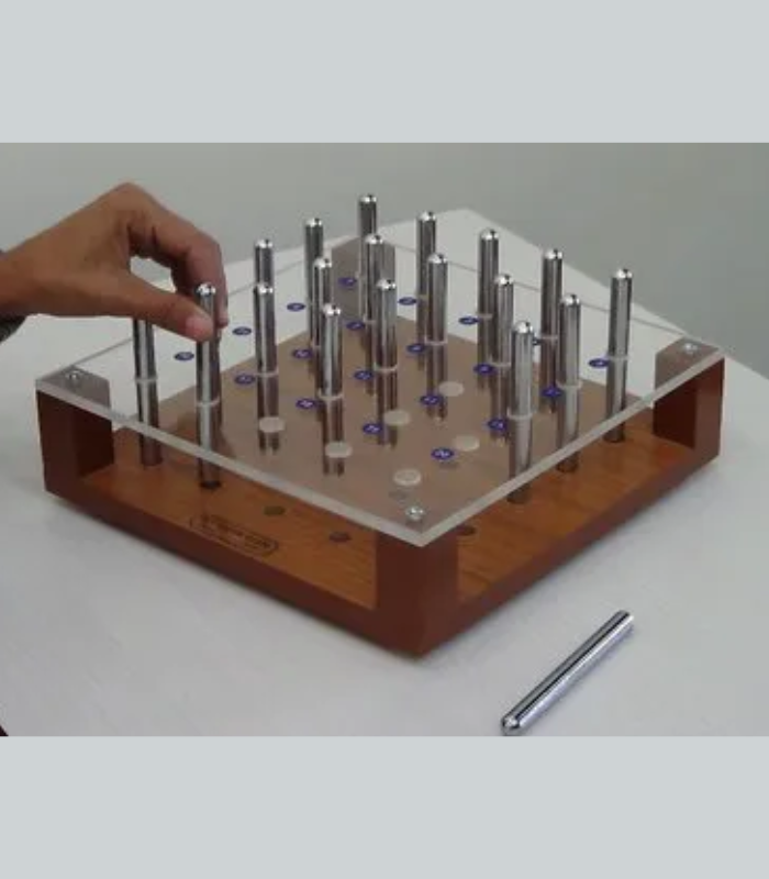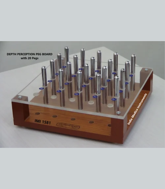 IMI 1581. Stimulates depth perception and eye-hand co-ordination on two levels, challenging the user to correctly place them within the two-layered grid.* The top level of the Pegboard is of smooth, 08mm thick clear Acrylic sheet.* Board is 30 cm. square and has 25 holes of 12 mm. dia. in Upper & Lower level boards * The board comes with 20 (Twenty) chrome plated solid iron rod pegs to place in.* The bottom is made of laminated plywood with storage box.* Box have a storage drawer to keep Pegs/Accessories.