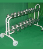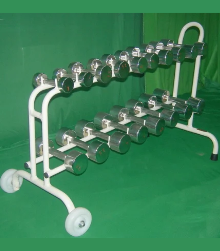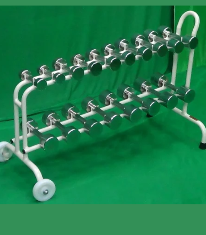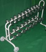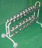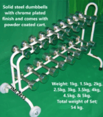 IMI 2855. Solid steel dumbbells with chrome plated finish and comes with powder coated cart.