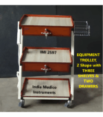 IMI 2597. “Z” shape, Equipment Trolley is ideal to place medical equipment.Specifications:* Frame; Tubular frame in “Z” shape with Powder Coated finish.* Shelves: Three laminated Shelves, Two fitted with Lockable Drawers. * Drawers: Two lockable Drawers (3″ deep) with laminated top. * Power Point: Trolley is fitted with Two Plug points with Main Wire.* Overall Size; 50 cm wide x 40 cm deep x 85 cm high. * Trolley fitted with a wire basket to keep accessories.* Mobility: Fitted with four 50mm dia. casters, Two with locking facility.