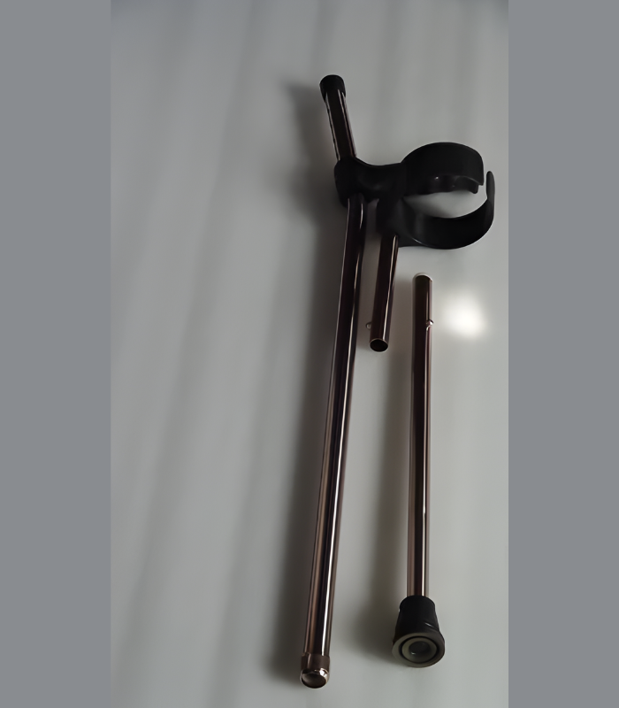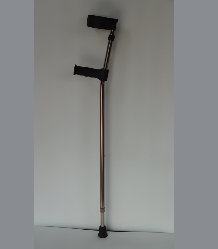 IMI-3055. Elbow / Forearm Crutches, Telescopic, lightweight Aluminium tube constructed unibody Elbow crutch has arm length and hand to ground distance adjustable with spring locking pins in proper notch.  Size: ADULT (Large).* Height Adjustment: 95cm to 118cm.* Forearm Adjustment: 10cm in 2.5cm steps (4 Steps).* Grip to Ground Adjustment: 20cm in 2.5cm steps (8 Steps).* Cuff & Hand Grip: Regular Forearm cuff and Hand grip is of moulded plastic.* Cuff: Regular Arm cuff with 90 degree tilt. * Shoe/Tip: Fitted with metal reinforcement Tip.* Finish; Aluminium Anodised.