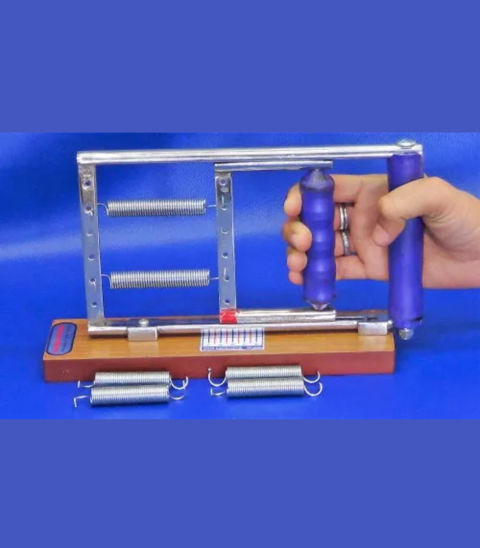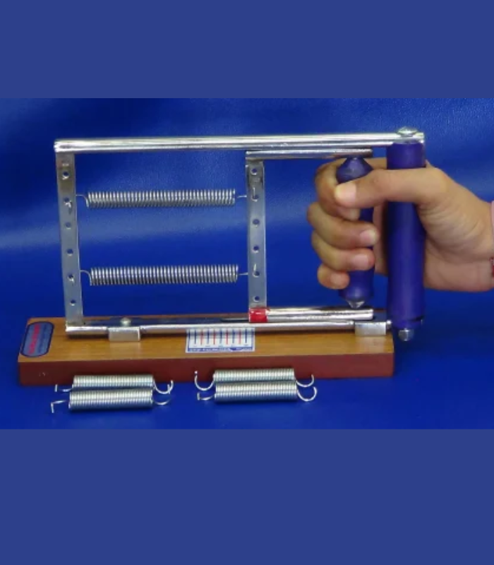 Finger & Grip exerciser is suitable for Adult patients with very weak / infirm hand.* Metal Frame with chrome plated finish is 240mm long x 140mm high and fitted with Two plastic handles.* Metallic Frame is fitted on a 250mm long x 75mm wide laminated base.* Unit gives light to heavy resistance with Six detachable springs.* The wooden base is fitted with a sticker, calibrated in centimetres and is provided with a mark to record the daily progress.