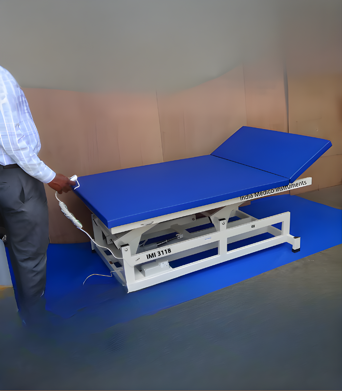 IMI 3118. HI-LOW Mat-Platform is ideal for range of motion, transfer, strength building and other active therapies. Platform with height adjustment and adjustable backrest makes delivering therapy easier for the therapist.SPECIFICATIONS:* Construction: Heavy Steel Frame, with heavy duty ‘8’ bush-bearings for easy Operation.* Top: Upholstered, Size 200cm long x 100cm wide. Height adjustable with Hand held switch.* Backrest: 67cm long, Backrest elevates so that the Back can be raised for manipulation techniques & more comfortable sitting. * Height: Table height is adjustable from 50cm to 95cm. Table provides smooth, quiet lift with Hand held switch.* Lifting System: Fitted with the extremely powerful motor (imported, jack system) that safely accommodates heavy Patients (130 kg). And ensures rapid and noiseless height adjustments.* Speed; Upward Speed 14 – 15 mm per second under full load.* Finish: Powder coated Frame, beautifully finished.* Power: Unit Operates on 220V AC.