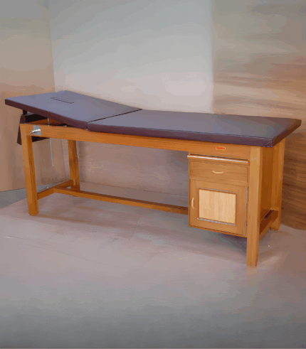 IMI 3110. Deluxe Examination cum Treatment Table with upholstered well padded top is provided with adjustable backrest which can be adjusted in height for desired position. SPECIFICATIONS: * Construction: Top is mounted on sturdily built, solid hardwood frame and legs to bear heavy weight. * Top: Size, 195cm x 65cm x 80cm high, well padded top is divided in Two sections. * Backrest: 70cm long, It can be continuously adjustable in height. * Backrest: With Face Hole / Breathing Hole & Plug. * Pillow; One, foam pillow with velcro straps to hold. * Storage: One Writing board, One Drawer with small cupboard is provided underneath the top for storage. * Finish: Natural wood-polish finish. Additional Information:
