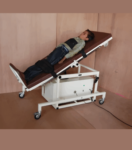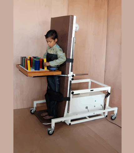 IMI-3121C Tilt Table Child (Electric with Activity Tray) Child size electrically operated Tilt Table with A.D.L activity Tray & foam padded upholstery, table works to standing position with heavy duty Actuator that provides silent and smooth Tilting action with hand-held push button control switches. SPECIFICATIONS: * Tilt System: Electrical operated Sealed Heavy duty system is well lubricated for life time performance,  * Range of Tilt: Adjustable from 0 to 90 degree. * Tilt Angle: Horizontal to 90 degree vertical in 60 seconds. (1.5 degree per Second) * Table Top: 152cm long x 60cm wide x 60cm high,: Tilts on Two heavy duty bushes. : Fitted with Tilt angle indicator.: Fitted with 35mm thick foam padded upholstery.: Fitted with Three, wide straps to hold patient.  * Base Frame: Welded frame is 75cm wide for more stability.: Made of Rectangular & 30mm square steel Tubes.: Legs fitted with 10cm dia. Lockable Castors for mobility. * Foot-Board: Foam Padded removable Footboard for easy Entry & Exit. * Utility Tray: Laminated surface for ADL activity. * Arm Supports: Tubular frame to grip for support. * Finish: Powder coated finish in light cream Colour. * Weight capacity: Maximum patient weight 60kg. * Power: 220V. AC. Additional Information: