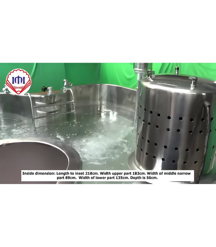 IMI 2501. Full body 'T' shape hydrotherapy tank for hydro-massage. The heavy gauge stainless steel tank rests on 40cm (16") high tubular stand re-enforced with cross bars. Overall size of the tank is 190cm (75") x 185cm (73") x 93cm (37"). Width of the narrow portion of the tank is 91cm (36") and depth inside the tank is 48cm (19"). Comes with Two motorized electric turbine ejectors & aerators with turbine carriages and elevators, Digital Thermometer, adjustable Head-Rest, and Body Stretcher & Sitting seat fitted with nylon cloth. Tank is fitted with two water inlets, One overflow and one Drain fittings. Tank is finished bright inside & painted outside. Specification: