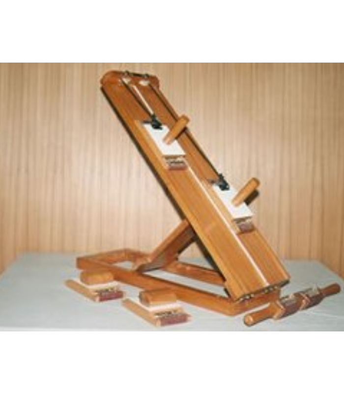 Consists of two wooden hinged planks, to adjust the angle of inclination. Upper board is fitted with one pulley at the top and one at the bottom for applying resistance by means of weights or sand bags. Rope passing over the pulley is tied to the hooks, attached to the sanding blocks. Size of the upper plank 40″x 8″, unit comes Complete with three different types of sanding blocks but without weights or sand bags.