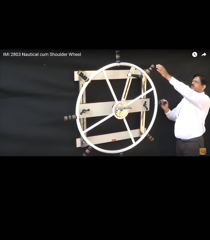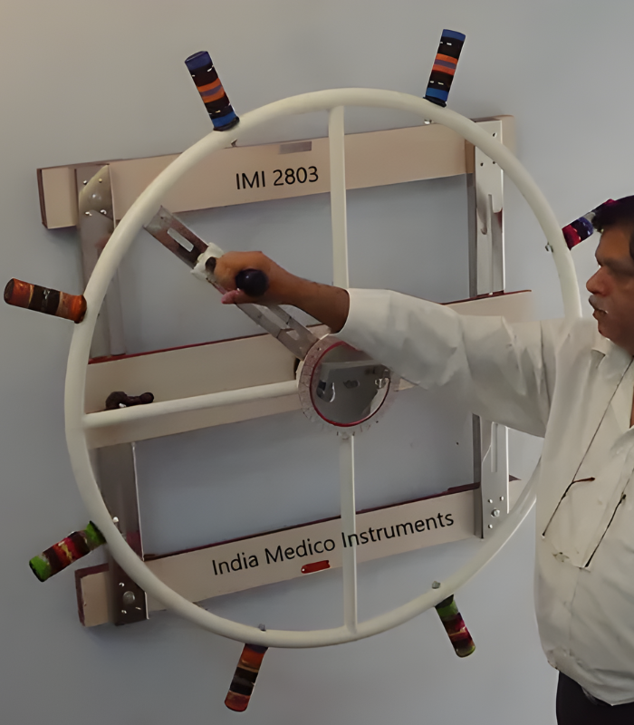 IMI 2803. All steel constructed Nautical cum Shoulder Wheel is fitted with Resistance mechanism and 360 degree scale. FEATURES:* Construction: 100cm diameter, tubular steel constructed Wheel is fitted with Precision machined plastic moulded drum & fitted with 127mm brake pads for resistance.* Movement: Bi-directional operation for shoulder & elbow.* Mounting: Wheel is mounted on Three laminated wall boards.* Arc of Motion: Shoulder Arc of motion can be varied on Stainless steel arm from 30cm to 80cm by fixing handle at the required place.* Nautical Motion: Fitted with 10cm long 8 handles on a tubular circle for Nautical Motion Exercises.* Height Adjustment: Two wall board are fitted with Two STAINLESS STEEL channels (81cm H x 6cm W) & Wheel can be raised or lowered by 50cm to suit each patient.* Resistance: Wheel is fitted with advanced Calibrated Sensitive Resistance mechanism and the resistance is controllable from Zero to Maximum.* Feed Back: A 360 degree scale is provided on the drum to measure & record the degree of revolution from either direction (for Left or Right Shoulder) for immediate feed-back to the patient. * Wall mountable unit: Set include Wall mounting hardware.* Finish: Powder coated finish with polished Stainless Steel channels.