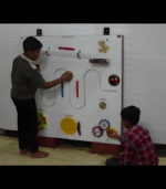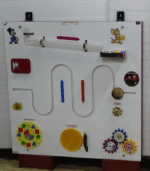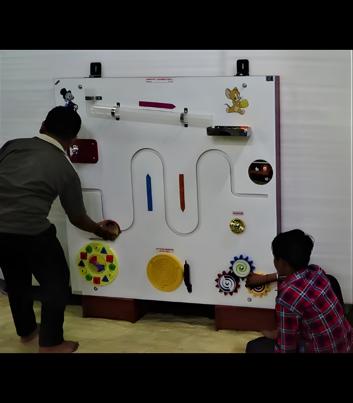 IMI 1340. Sensory learning panel (Sensory Wall) is to promote focus and concentration, participation, interaction, motor skills, to introduce ‘Cause & Effect’, encourage success, calm and distract negative behaviour, and open up a window of communication and connection.* Construction; Panel is made of WPC board & Ply-Board.* Gadgets: Sensory wall panel is fitted with different gadgets & tracking/path finder. 1, Full-length Track with One Tracking Disks & destination spot. 2, Construct a Clock with magnetic Numbers in different shapes & colours. 3, Door & Latch: A door is fitted with hardware. 4, Acrylic Tunnel: 1 meter long with 06 racing balls in different colours. 5, Wooden Gears: 3 Interlinked Gears of 15 cm diameter & finished in different colours. 6. Spinner: Fitted with One spinner to move & enjoy. 7. Magnetic Vault: find a way to move the diamond in the vault.* Panel be mounted on wall for easy access of patient.* Size; Panel measure approximately 120 cm long x 120 cm high x 15cm deep.* Panel comes with wall fixing hard-ware.