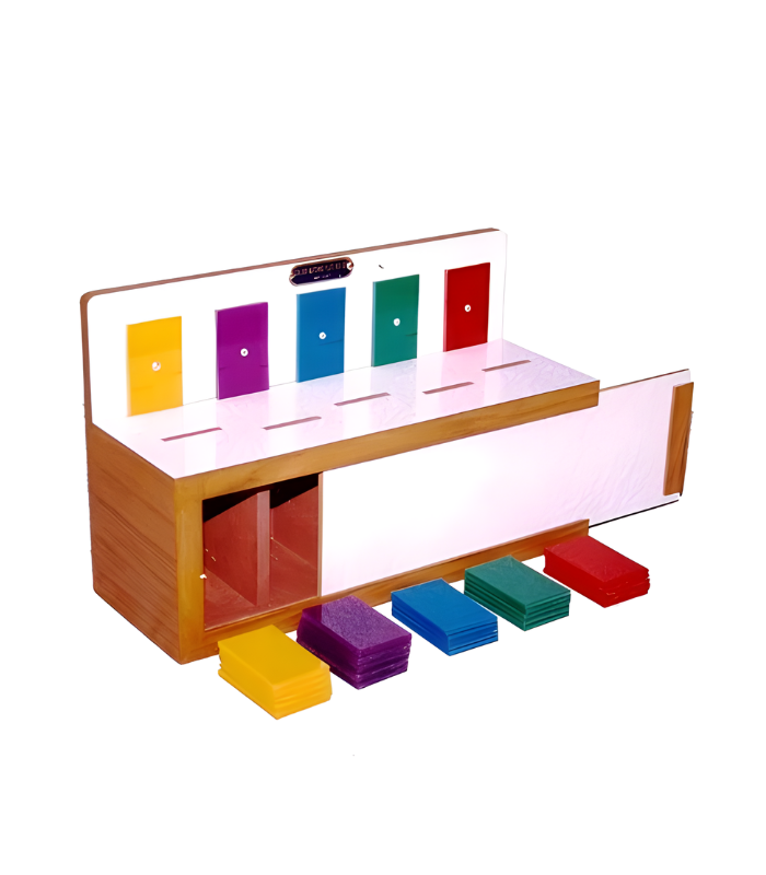 IMI 1447. Sorting, Matching & Posting Box unit measures an individual basic level of function in the area of color identification and Eye-hand co-ordination.* Construction: Laminated Wooden box with Five multicolor plastic plates fixed at the top with five Slots to Post matching color plates there in.* Color Plates: Comes with 25 well-polished plastics plates in 5 different colors to sort, match and post.* Box with Five compartments is fitted with sliding door to store plates and also works as posting box.* Finish: Natural polish finish with laminated tops & door.