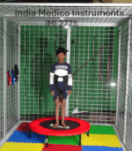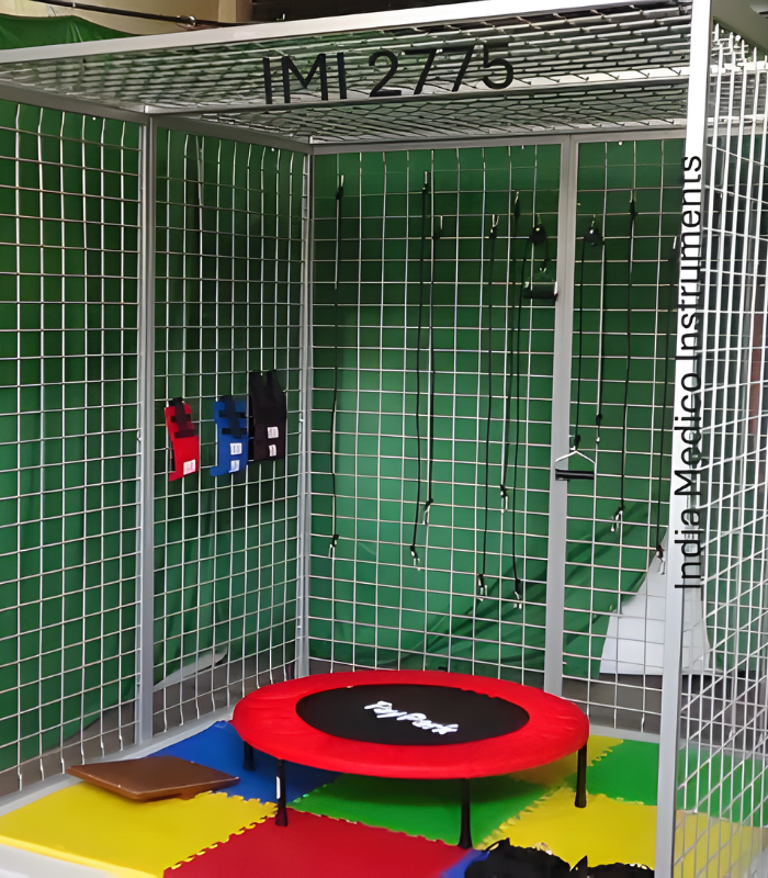 IMI 2775. Spider therapy is an active form of treatment used in both Physical and Occupational therapy for Cerebral Palsy. It involves placing the child in the middle of Spider Cage while they wear a belt or suit that attaches to multiple elastic bungee cords of varying resistance levels.* Construction; Eight, square tube constructed panels filled with square hole wire mesh are bolted togather to form a cage for suspension ativities.* Each panel measures: 200cm high x 100cm wide with proper holes & bolts.* Approx.overall size of cage: 200cm x 200cm x 200cm.* Unit supplied as a self assembly kit. * Accessories supplied with the Cage: * Bungee Cords with snap hooks = 08 pcs. * Trampoline 39″ = 01. * Pulleys with hooks = 02 pcs. * Weight-Cuffs of different weights = 03 pcs. * Patient Holding Belts = 02 pcs. * Balance Board = 01. * Interlocking Floor Mats = 09.