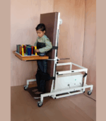 Child size electrically operated Tilt Table with A.D.L activity Tray & foam padded upholstery, table works to standing position with heavy duty Actuator that provides silent and smooth Tilting action with hand-held push button control switches. SPECIFICATIONS: * Tilt System: Electrical operated Sealed Heavy duty system is well lubricated for life time performance, * Range of Tilt: Adjustable from 0 to 90 degree. * Tilt Angle: Horizontal to 90 degree vertical in 60 seconds. (1.5 degree per Second) * Table Top: 152cm long x 60cm wide x 60cm high,: Tilts on Two heavy duty bushes. : Fitted with Tilt angle indicator.: Fitted with 35mm thick foam padded upholstery.: Fitted with Three, wide straps to hold patient. * Base Frame: Welded frame is 75cm wide for more stability.: Made of Rectangular & 30mm square steel Tubes.: Legs fitted with 10cm dia. Lockable Castors for mobility. * Foot-Board: Foam Padded removable Footboard for easy Entry & Exit. * Utility Tray: Laminated surface for ADL activity. * Arm Supports: Tubular frame to grip for support. * Finish: Powder coated finish in light cream Colour. * Weight capacity: Maximum patient weight 60kg. * Power: 220V. AC.