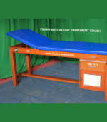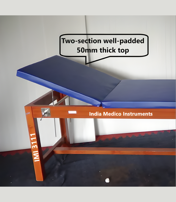 IMI 3109. Deluxe Examination Couch with Paper Roll Hold & Storage facility is provided with adjustable Backrest. SPECIFICATIONS:* Construction: Top is mounted on sturdily built Teak-wood solid legs with H-brace to provide stable treatment surface.* Size: Top, 182cm long x 61cm wide x 80cm high, well padded 40mm thick top is covered with good quality Rexene.* Backrest: 60cm long, can be continuously adjustable in height.* Top: Two-section well-padded thick top. * Paper Roll: Table has arrangment to hold paper Roll & a Cutter to cut the paper.* Writing Board: One laminated writing board is provided under the Top.* Storage: One drawer & one small cupboard is provided underneath the top for storage.* Finish: Natural wood-polish finish.