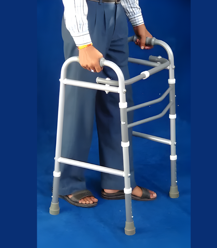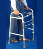 Walker pivots on its two front legs, allowing it to be moved forward one side at a time, in step with the user. It also folds for easy transportation & storage.TECHNICAL SPECIFICATIONS:* Frame: Sturdy 25mm diameter anodized aluminum construction.* Height: Frame is adjustable from 76cm to 94cm by slipping spring locking pins in proper notch.* Inside Measurements: Width 50cm. X Depth 40cm.* Grips: Fitted with soft PVC hand grips.* Shoes/Tips: Four, broad based PVC shoes.* Approx. Measurements in folded position: 78cm x 55cm x 13cm.  App. Weight: 2.5kg. Additional Information: