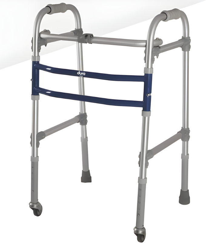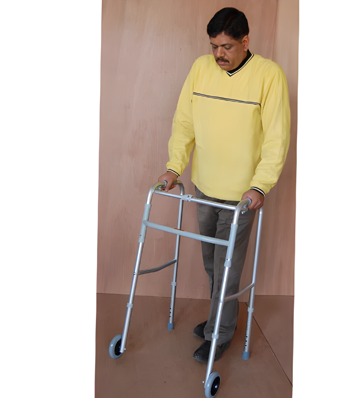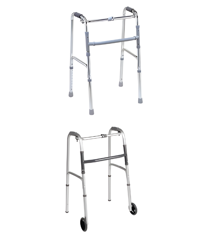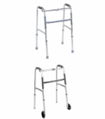 Walker fitted with wheels on front legs, allowing it to be moved forward with slight push. It also folds easily for transportation & storage.TECHNICAL SPECIFICATIONS:* Frame: Sturdy 25mm diameter anodized aluminum construction.* Height: Frame is adjustable from 79cm to 89cm by slipping spring locking pins in proper notch.* Inside Measurements. : Width 45cm. X Depth 45cm.* Wheels; Two, of 5″ diameter on front legs.* Grips: Fitted with soft PVC hand grips.* Shoes/Tips: Two, broad based PVC shoes.* Approx. Measurements in folded position: 78cm x 55cm x 15cm.