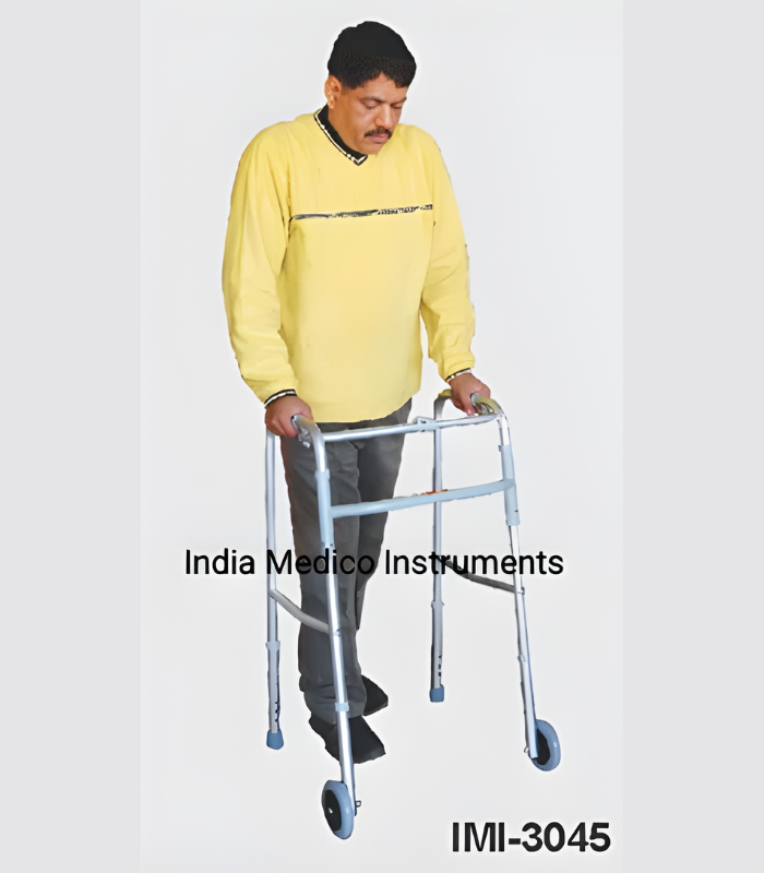 IMI 3035. Light weight foldable Rollator Walker, Patient pushes the handle bars to walk & front fixed wheels eliminate side motion. Specifications; * Construction : Light weight foldable walker, constructed of ERW 25mm dia. steel tubing. * Mounting : Mounted on Two 10cm dia. front wheels and Two safty PVC tips on rear legs. * Fixed front wheels eliminate side motion. * Height Adjustment : Handles adjusts from 75cm to 100cm. * Suitable for Adult patients. * Grip: Each handle bar is individually adjustable for an exact fit. * Finish: Powder coated finish with chrome plated working parts. Additional Information: